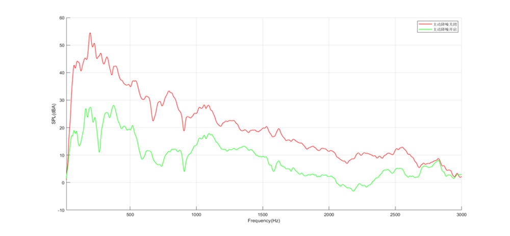 例如,圖中的紅色曲線(xiàn)是主動(dòng)降噪關(guān)閉后的噪音曲線(xiàn),綠色曲線(xiàn)是主動(dòng)降噪開(kāi)啟后的噪聲曲線(xiàn),中間的差額就是降噪深度。