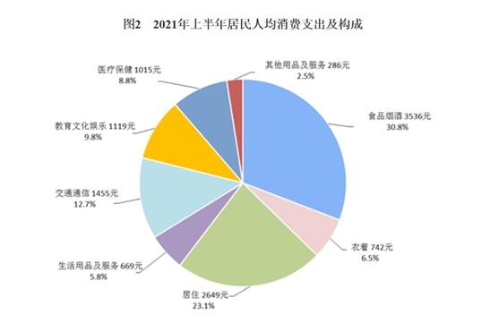 上半年,全國居民人均消費支出11471元,比上年同期名義增長18.0%,扣除價格因素,實際增長17.4%,比2019年上半年增長11.0%,兩年平均增長5.4%,扣除價格因素,兩年平均實際增長3.2%。