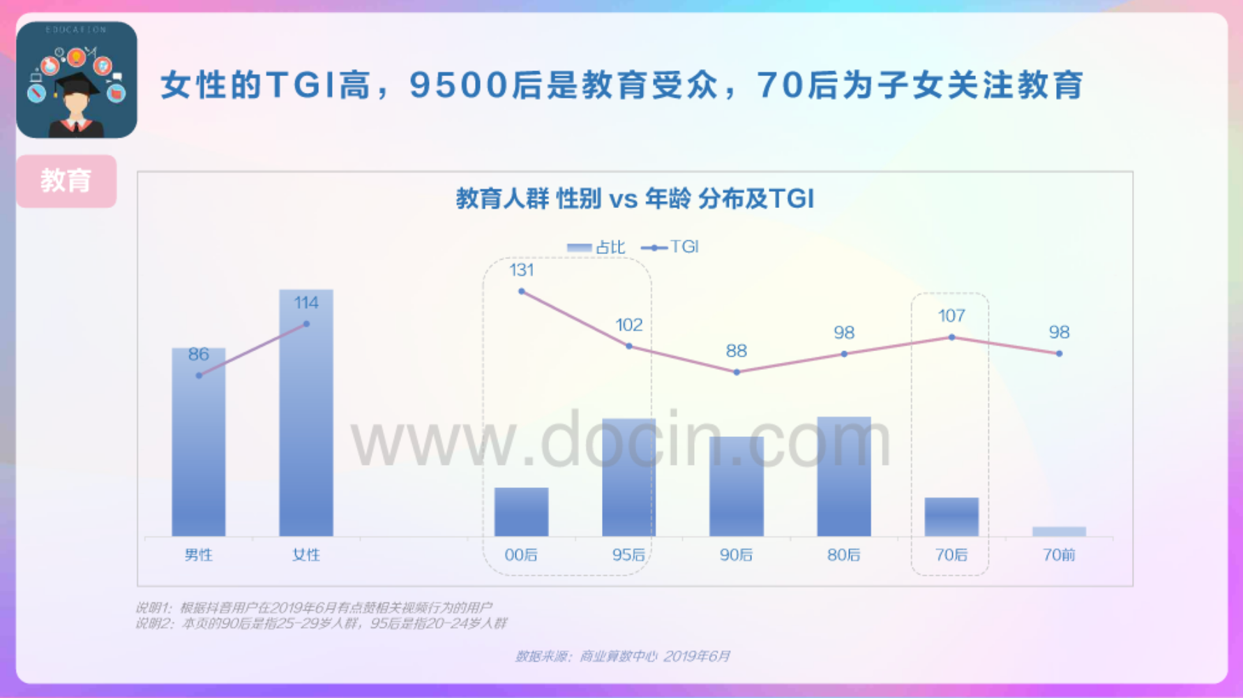 雖然男性比例高,然而對于教育類內(nèi)容,抖音女性用戶偏好度高于男性。不同代際中,95-00后(24歲以下)是主要的教育受眾,70后為子女關(guān)注教育。注意,這和抖音大盤的用戶畫像有差異。