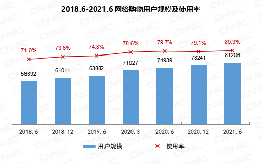 截至2021年6月,我國網絡購物用戶規(guī)模達8.12億,較2020年12月增長2965萬,占網民整體的80.3%。