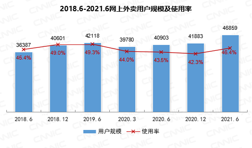 截至2021年6月,我國網上外賣用戶規(guī)模達4.69億,較2020年12月增長4976萬,占網民整體的46.4%。
