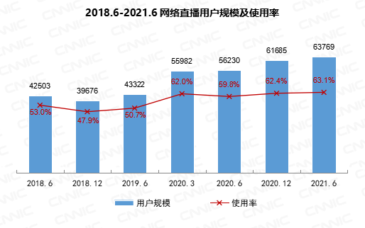 截至2021年6月,我國網絡直播用戶規(guī)模達6.38億,同比增長7539萬,占網民整體的63.1%。其中,電商直播用戶規(guī)模為3.84億,同比增長7524萬,占網民整體的38.0%。
