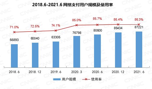 截至2021年6月,我國網絡支付用戶規(guī)模達8.72億,較2020年12月增長1787萬,占網民整體的86.3%。