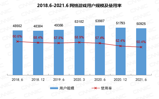 截至2021年6月,我國網絡游戲用戶規(guī)模達5.09億,較2020年12月減少869萬,占網民整體的50.4%。