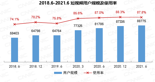 截至2021年6月,我國網絡視頻(含短視頻)用戶規(guī)模達9.44億,較2020年12月增長1707萬,占網民整體的93.4%。其中短視頻用戶規(guī)模為8.88億,較2020年12月增長1440萬,占網民整體的87.8%。