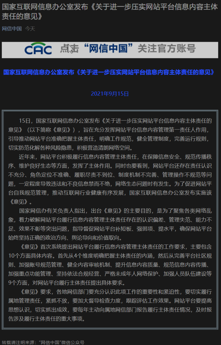網(wǎng)信辦今日發(fā)布《關(guān)于進(jìn)一步壓實網(wǎng)站平臺信息內(nèi)容管理主體責(zé)任的意見》。