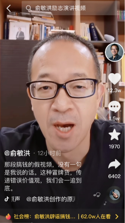 針對這些搞錢言論視頻,俞敏洪本人通過個人抖音社交賬號發(fā)布了一段小視頻進行辟謠:“那段搞錢的假視頻,沒有一句是我說的話。這種冒牌貨,傳遞錯誤價值觀,我們會一追到底。”