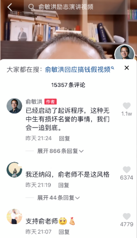 可能視頻內(nèi)容還未能完全表達完自己的意思,俞敏洪還在留言區(qū)透露:“已啟動起訴程序,這種無中生有損壞名譽的事情,我們會一追到底。”