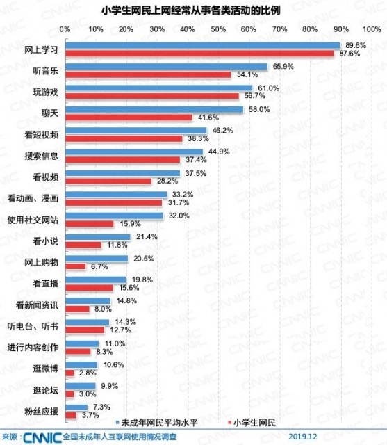 未成年網(wǎng)民經(jīng)常利用互聯(lián)網(wǎng)進行學(xué)習(xí)的比例達到89.6%。 上網(wǎng)聽音樂和玩游戲是主要的網(wǎng)上休閑娛樂活動,分別占65.9%和61.0%。上網(wǎng)聊天作為網(wǎng)上溝通社交的主要方式,占58.0%??炊桃曨l和網(wǎng)絡(luò)直播的比例保持較高增長,分別較2018年提升5.7和6.4個百分點。