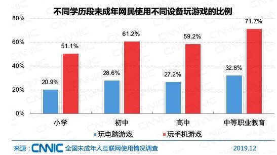 不同學(xué)歷段對比發(fā)現(xiàn),雖然小學(xué)生網(wǎng)民使用電腦和手機玩游戲的比例為各學(xué)歷段最低,但依然達到20.9%和51.9%;初中生網(wǎng)民使用電腦和手機玩游戲的比例分別為28.6%和61.2%,高中生由于學(xué)業(yè)壓力更大,玩游戲比例反而比初中生要略低一些。