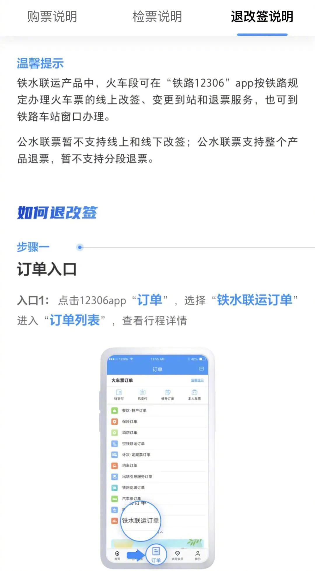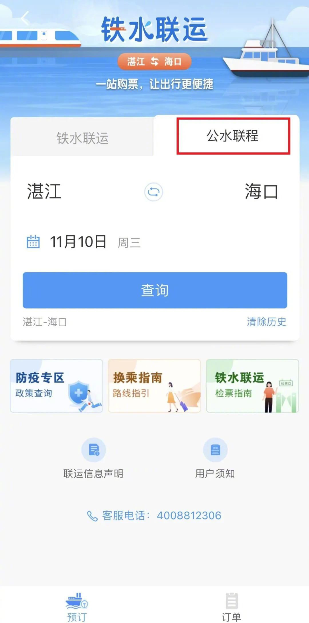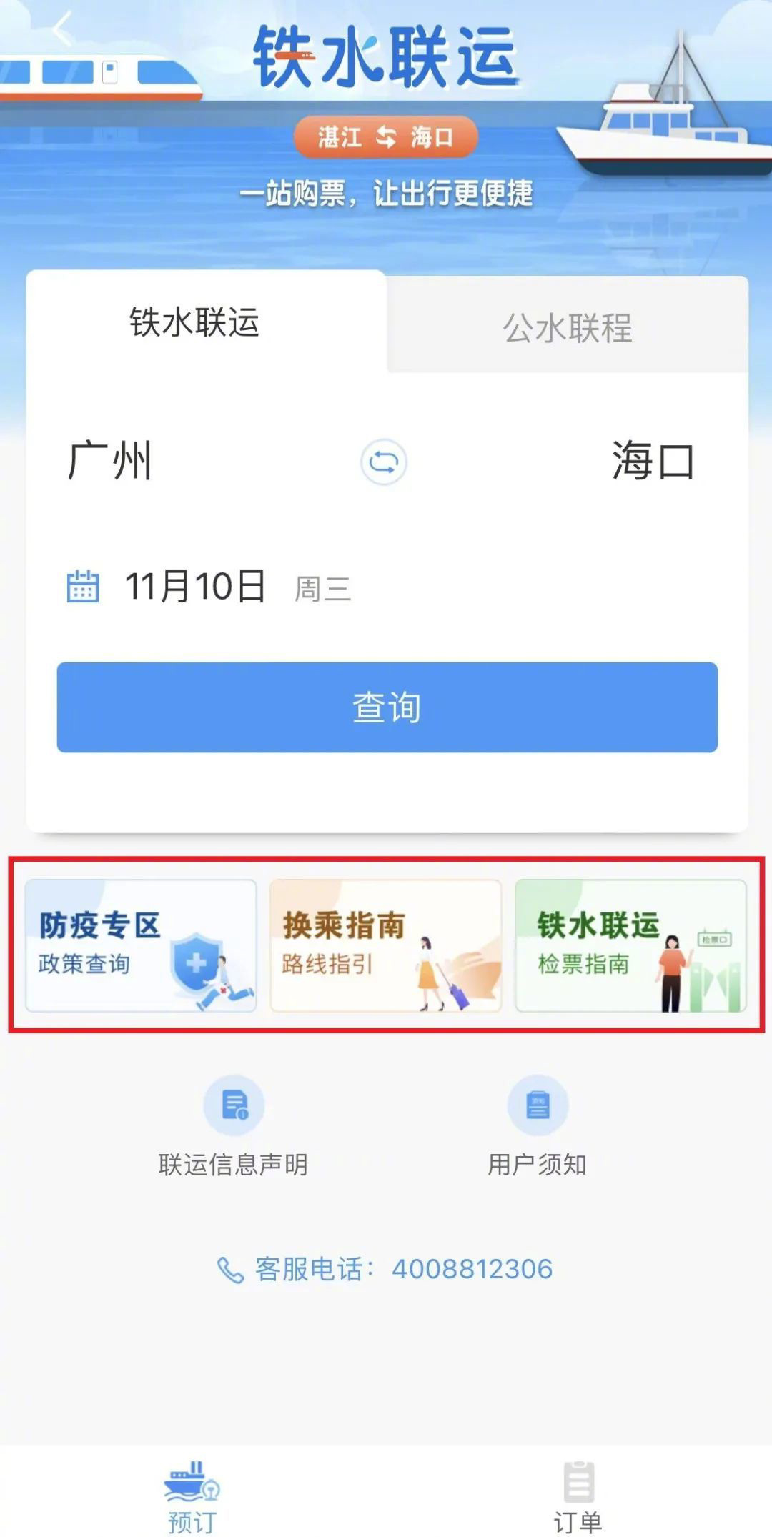 “鐵水聯(lián)運”界面還設(shè)置了防控專區(qū)、換乘指南、退改簽說明等,旅客可根據(jù)出行需求進行查詢。