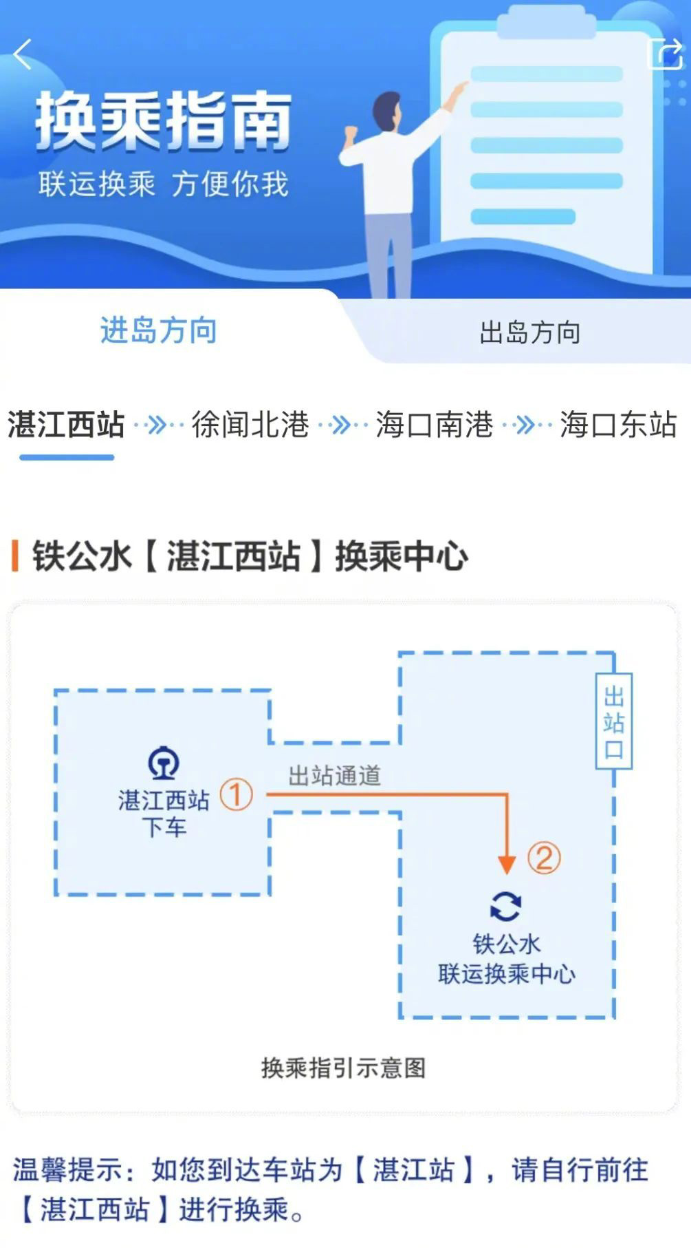 怕迷路的小伙伴不用慌,湛江西站、徐聞北港、南港碼頭和??跂|站等地均設(shè)有換乘中心,鐵路工作人員會為您提供咨詢及引導(dǎo)服務(wù)。