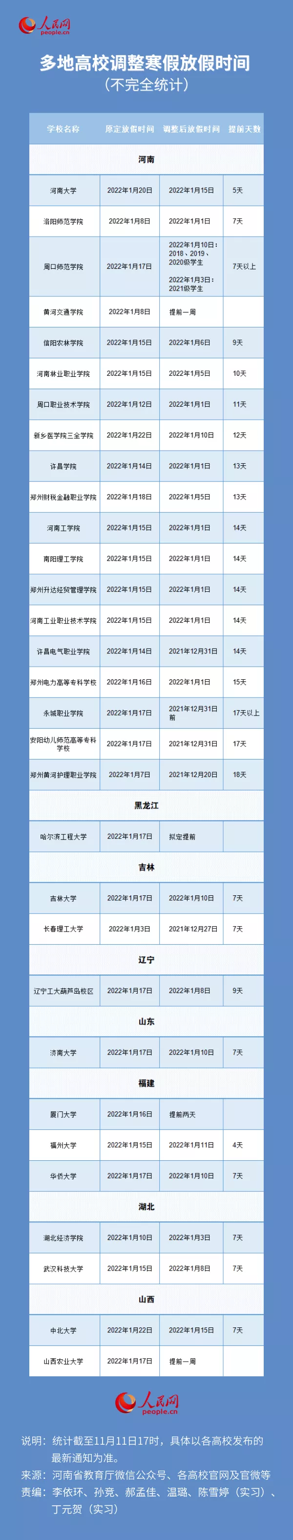 2021-11-13 07:25:10閱讀()人民網(wǎng)為進(jìn)一步做好校園疫情防控工作,保障師生員工健康安全,多地高校根據(jù)國(guó)內(nèi)疫情形勢(shì)和學(xué)校實(shí)際情況,結(jié)合師生意愿和需求,陸續(xù)調(diào)整寒假放假時(shí)間。人民網(wǎng)對(duì)部分高校的放假安排進(jìn)行了梳理,以供參考。