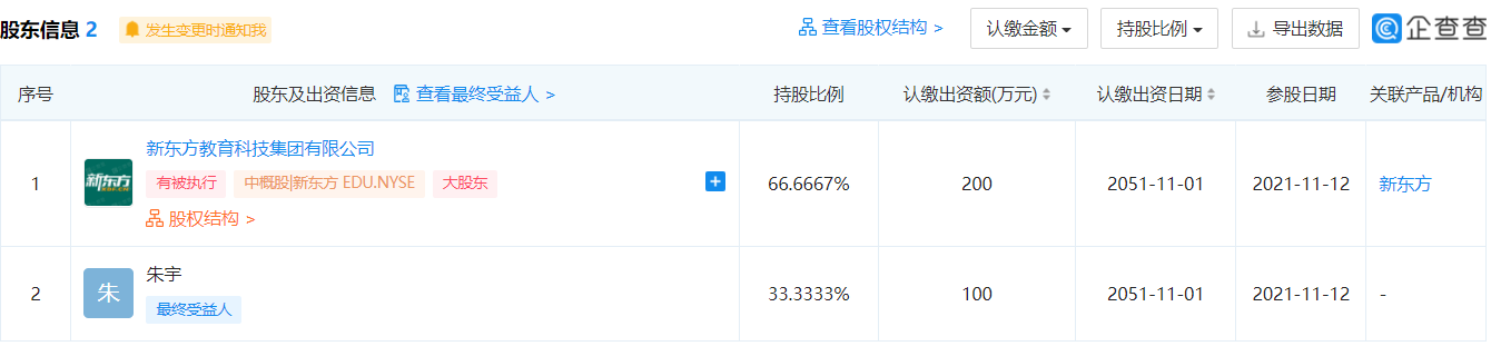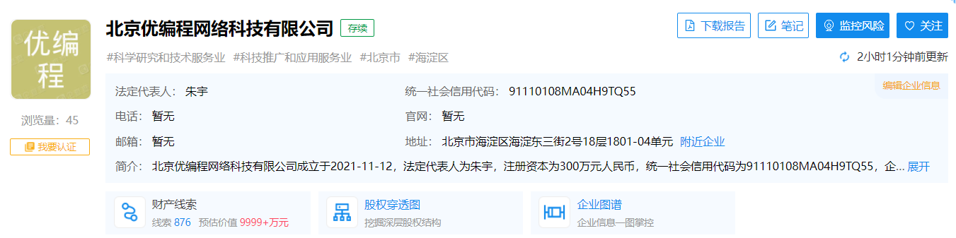 企查查App顯示,近日,北京優(yōu)編程網(wǎng)絡(luò)科技有限公司成立,注冊(cè)資本300萬(wàn)人民幣,法定代表人為朱宇,經(jīng)營(yíng)范圍包括軟件開發(fā);模型設(shè)計(jì);教育咨詢;銷售文化用品、計(jì)算機(jī)、軟件及輔助設(shè)備等。股東信息顯示,該公司由新東方教育科技集團(tuán)有限公司、朱宇分別持股約66.67%、33.33%。