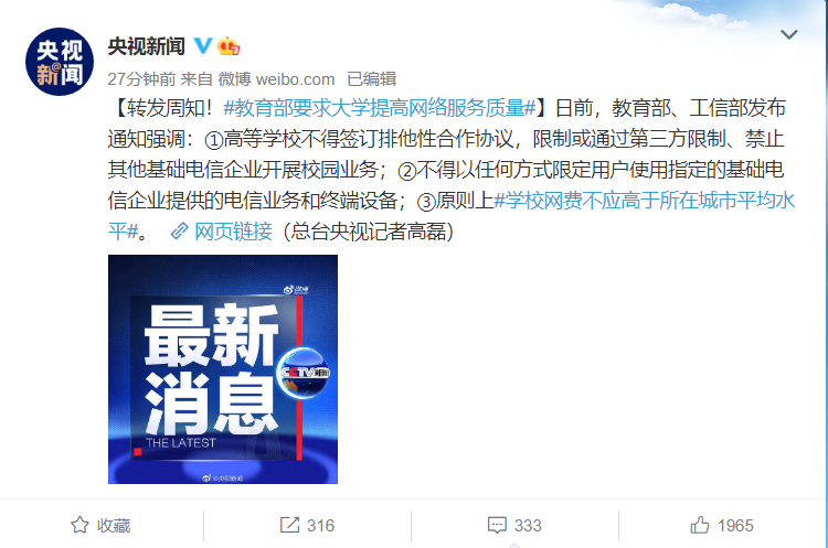 日前,教育部、工信部發(fā)布通知強調(diào):①高等學(xué)校不得簽訂排他性合作協(xié)議,限制或通過第三方限制、禁止其他基礎(chǔ)電信企業(yè)開展校園業(yè)務(wù);②不得以任何方式限定用戶使用指定的基礎(chǔ)電信企業(yè)提供的電信業(yè)務(wù)和終端設(shè)備;③原則上學(xué)校網(wǎng)費不應(yīng)高于所在城市平均水平。