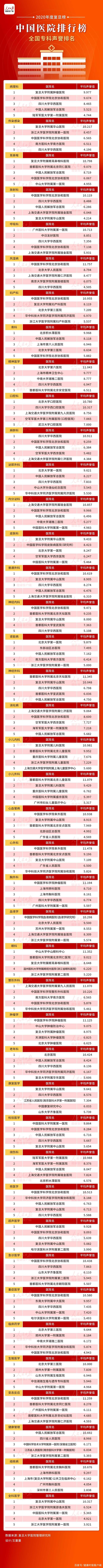 2021-11-21 23:49:15閱讀()人民日?qǐng)?bào)(健康時(shí)報(bào)記者 尹薇 復(fù)旦大學(xué)醫(yī)院管理研究所 孫國(guó)根)11月20日下午,復(fù)旦大學(xué)醫(yī)院管理研究所在上海發(fā)布復(fù)旦版《2020年度中國(guó)醫(yī)院綜合排行榜》和《2020年度中國(guó)醫(yī)院專科聲譽(yù)排行榜》。全國(guó)共有100家醫(yī)院進(jìn)入“復(fù)旦版中國(guó)醫(yī)院綜合排行榜”,??坡曌u(yù)排行榜中設(shè)置了42個(gè)專科。這是復(fù)旦大學(xué)醫(yī)院管理研究所作為獨(dú)立第三方連續(xù)第十二年發(fā)布醫(yī)院排行榜。