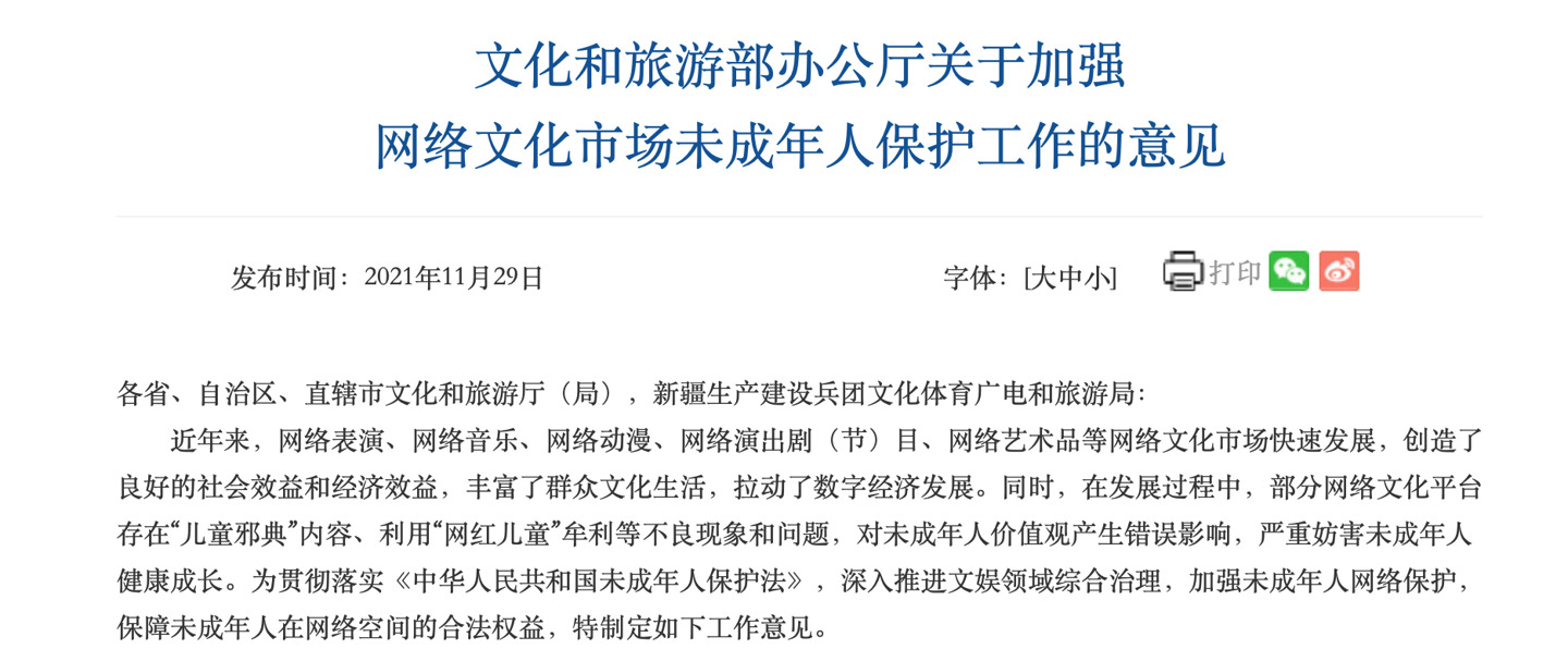 文化和旅游部辦公廳關(guān)于加強(qiáng)網(wǎng)絡(luò)文化市場未成年人保護(hù)工作的意見