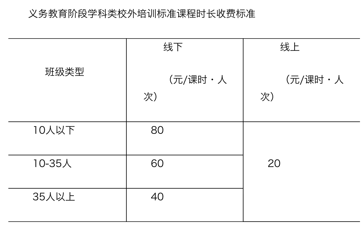 《通知》規(guī)定,10人以下、10~35人、35人以上的線下學(xué)科類校外培訓(xùn)收費(fèi)標(biāo)準(zhǔn)分別為80元、60和40元/課時(shí)/人,線上課程20元/人/課時(shí)。《通知》明確,培訓(xùn)機(jī)構(gòu)可在上述收費(fèi)標(biāo)準(zhǔn)基礎(chǔ)上,在上浮不超過(guò)10%、下浮不限的范圍內(nèi)。本通知自本市中小學(xué)2022年春季學(xué)期開(kāi)學(xué)(2022年2月17日)起施行。
