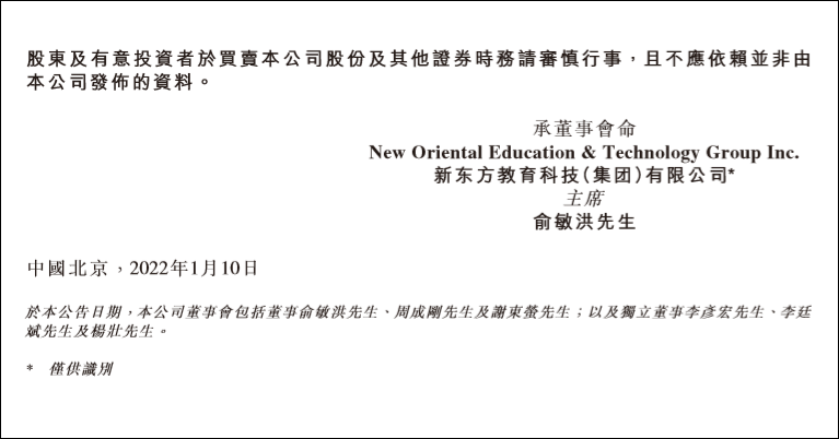 新東方在公告中指出,公司提醒股東及投資者,該等媒體刊物并無(wú)獲公司授權(quán)及并不代表本公司觀點(diǎn)。只有公司發(fā)布并于香港聯(lián)交所網(wǎng)站及美國(guó)證券交易委員會(huì)網(wǎng)站上披露的數(shù)據(jù),方可作為有關(guān)公司及來(lái)自公司的數(shù)據(jù)。