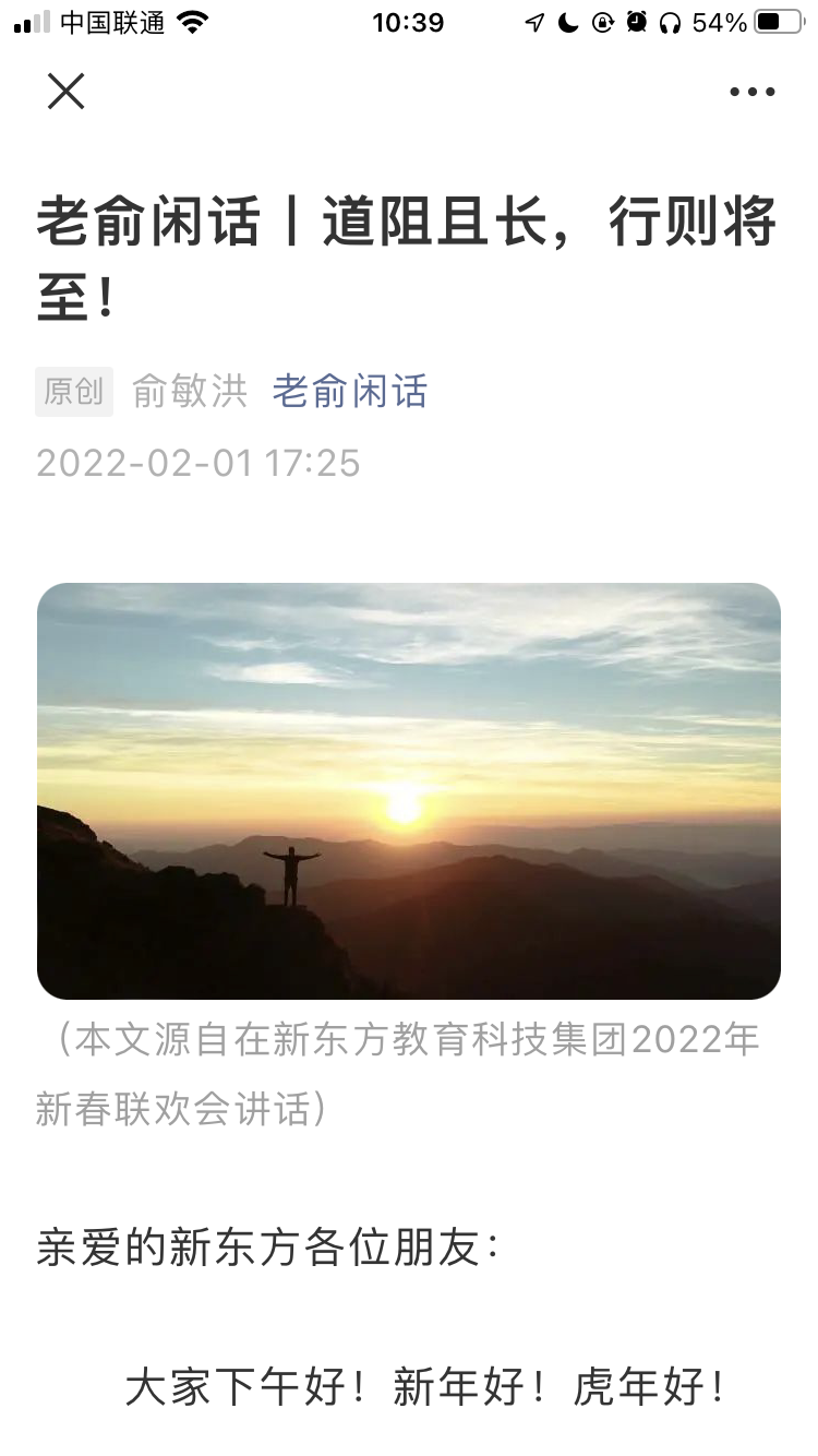 2022-02-02 14:31:09閱讀()互聯(lián)網(wǎng)昨天下午,俞敏洪在其個(gè)人公眾號(hào)上分享了其在新東方教育科技集團(tuán) 2022 年新春聯(lián)歡會(huì)講話。俞敏洪表示,2021 年的困難和曲折,對(duì)于新東方來(lái)說(shuō)確實(shí)是一個(gè)重大的考驗(yàn)。