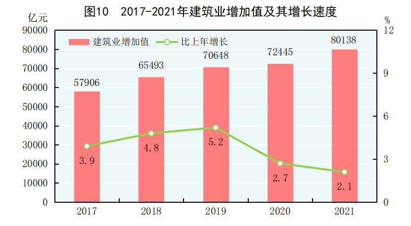 全年建筑業(yè)增加值80138億元,比上年增長2.1%。全國具有資質(zhì)等級的總承包和專業(yè)承包建筑業(yè)企業(yè)利潤8554億元,比上年增長1.3%,其中國有控股企業(yè)3620億元,增長8.0%。