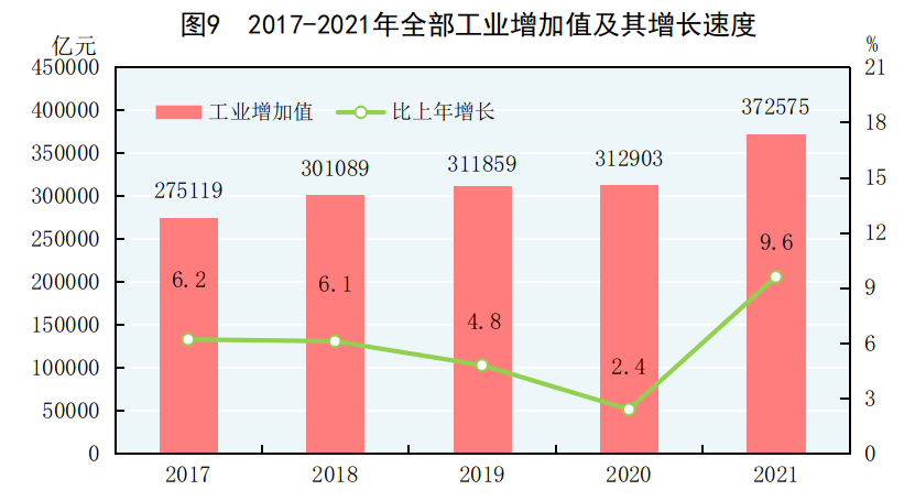 全年全部工業(yè)增加值372575億元,比上年增長9.6%。規(guī)模以上工業(yè)增加值增長9.6%。在規(guī)模以上工業(yè)中,分經(jīng)濟類型看,國有控股企業(yè)增加值增長8.0%;股份制企業(yè)增長9.8%,外商及港澳臺商投資企業(yè)增長8.9%;私營企業(yè)增長10.2%。分門類看,采礦業(yè)增長5.3%,制造業(yè)增長9.8%,電力、熱力、燃氣及水生產(chǎn)和供應(yīng)業(yè)增長11.4%。