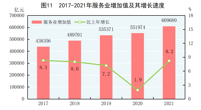 全年批發(fā)和零售業(yè)增加值110493億元,比上年增長11.3%;交通運輸、倉儲和郵政業(yè)增加值47061億元,增長12.1%;住宿和餐飲業(yè)增加值17853億元,增長14.5%;金融業(yè)增加值91206億元,增長4.8%;房地產(chǎn)業(yè)增加值77561億元,增長5.2%;信息傳輸、軟件和信息技術(shù)服務(wù)業(yè)增加值43956億元,增長17.2%;租賃和商務(wù)服務(wù)業(yè)增加值35350億元,增長6.2%。全年規(guī)模以上服務(wù)業(yè)企業(yè)營業(yè)收入比上年增長18.7%,利潤總額增長13.4%。