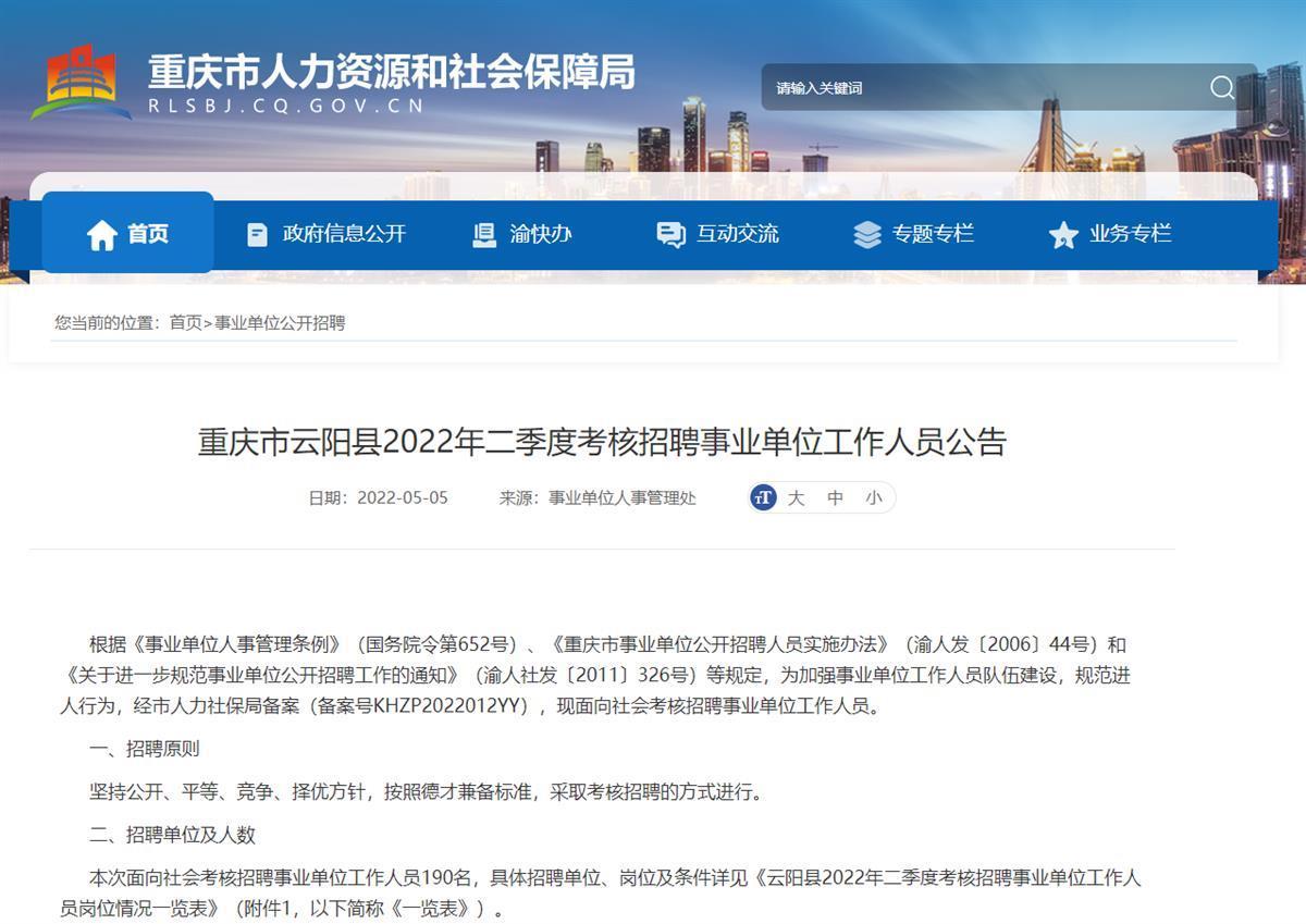 2022-05-22 08:35:07閱讀()互聯(lián)網(wǎng)近日,重慶云陽縣發(fā)布2022年二季度考核招聘事業(yè)單位工作人員公告,引起大量網(wǎng)友關(guān)注。極目新聞記者注意到,本次招聘工作人員190名,其中176個名額要求碩士生學(xué)歷及相應(yīng)學(xué)位,直到報名截止前一天,仍有73個崗位無人報名。其中一家用人單位回復(fù),如最終無人報名,招聘崗位可能會取消。