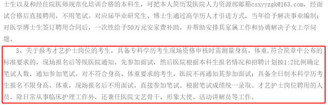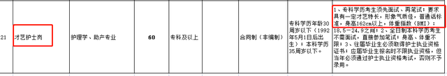 值得注意的是,該崗位在“其他條件”中要求:“專科學(xué)歷考生須先面試、再筆試;要求具有一定才藝特長(zhǎng),形象氣質(zhì)佳,普通話標(biāo)準(zhǔn),身高162cm以上,體重指數(shù)(BMI):18.5—24.9之間”,但“全日制本科學(xué)歷考生不需面試,直接參加筆試;身高、體重不限”;往屆生須具有護(hù)士執(zhí)業(yè)資格證書(或成績(jī)合格證),應(yīng)屆生暫時(shí)不限執(zhí)業(yè)證書,但當(dāng)年必須參加護(hù)士執(zhí)業(yè)資格考試并成績(jī)合格,否則不予錄用。”