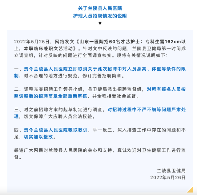 5月26日晚間,蘭陵縣衛(wèi)健局針對(duì)此事發(fā)布說明稱,取消關(guān)于此次招聘中對(duì)人員身高、體重等條件的限制,對(duì)招聘過程中不嚴(yán)不細(xì)等問題嚴(yán)肅處理。
