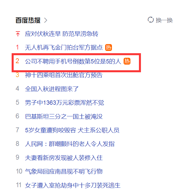2022-09-01 08:45:17閱讀()互聯(lián)網(wǎng)又現(xiàn)就業(yè)歧視?8月31日報道,近日,網(wǎng)傳深圳某教育公司招聘員工時,要求手機倒數(shù)第五位數(shù)字不能為“5”引網(wǎng)友熱議,該新聞還登上了百度熱搜。