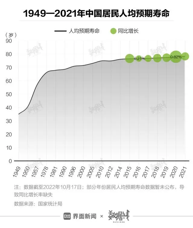 國(guó)家統(tǒng)計(jì)局?jǐn)?shù)據(jù)顯示,新中國(guó)成立初期我國(guó)人均預(yù)期壽命僅為35歲,而在2021年,我國(guó)人均預(yù)期壽命已上漲43.2歲至78.2歲,漲幅達(dá)123.43%。界面數(shù)據(jù)統(tǒng)計(jì)發(fā)現(xiàn),2015年-2021年,我國(guó)人均預(yù)期壽命逐年增長(zhǎng),但增幅較小且值呈波動(dòng)趨勢(shì),均在1%以下。