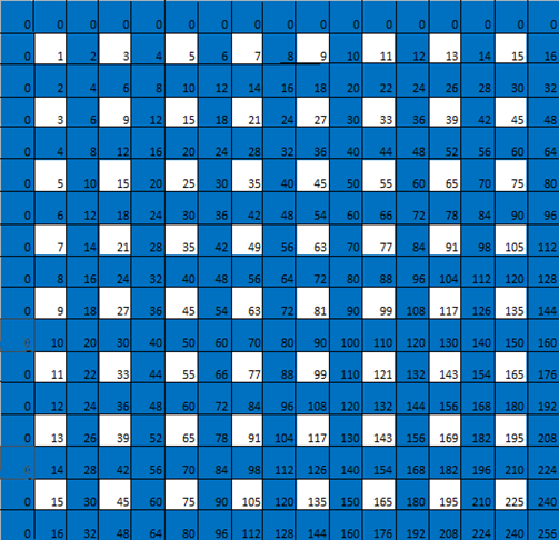 現(xiàn)在,我們把 2 的倍數(shù)(所有的偶數(shù))對(duì)應(yīng)的方格都涂上藍(lán)色。這意味著,與 2 的倍數(shù)對(duì)應(yīng)的所有行和列也都是藍(lán)色的,這樣我們就得到了一個(gè)藍(lán)色的網(wǎng)格。不在這個(gè)藍(lán)色網(wǎng)格中的方格都是白色的。(這里我們?cè)谒椒较蚝拓Q直方向?qū)⒈砀駭U(kuò)展到了數(shù)字 16。)