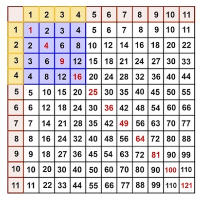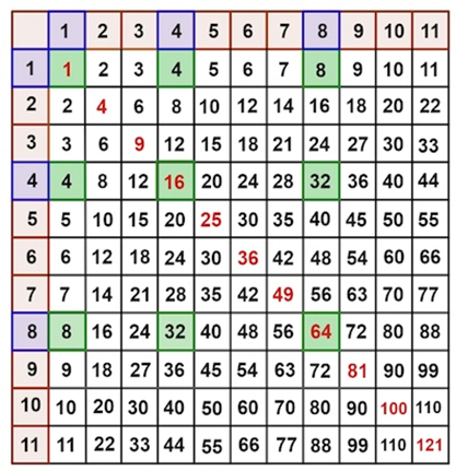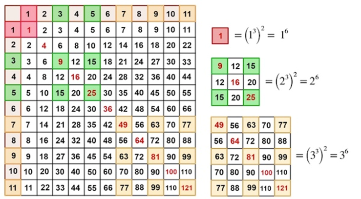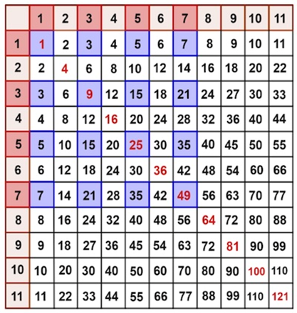在整數(shù)的海洋中,乘法表主對(duì)角線(從西北角到東南角)上的紅色數(shù)字顯然是平方數(shù) —— 整數(shù)的 2 次方。