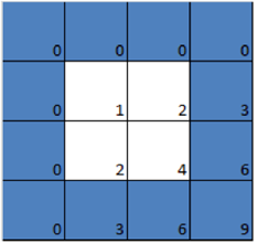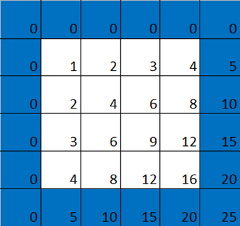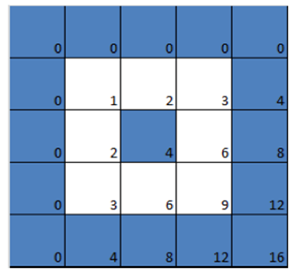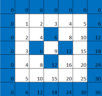 我們?cè)诒砀竦捻敳亢妥髠?cè)各添加一行 / 列 0,仍然是一個(gè)乘法表,只是便于我們看出下面的一些圖案。