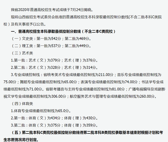 本科一批:理工類(lèi)為515分,文史類(lèi)為541分;本科二批:理工類(lèi)為435分,文史類(lèi)為499分。