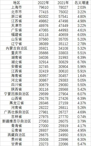表:31個省份2022年居民人均可支配收入及名義增速(單位:元。來源:根據(jù)國家統(tǒng)計局?jǐn)?shù)據(jù)整理)