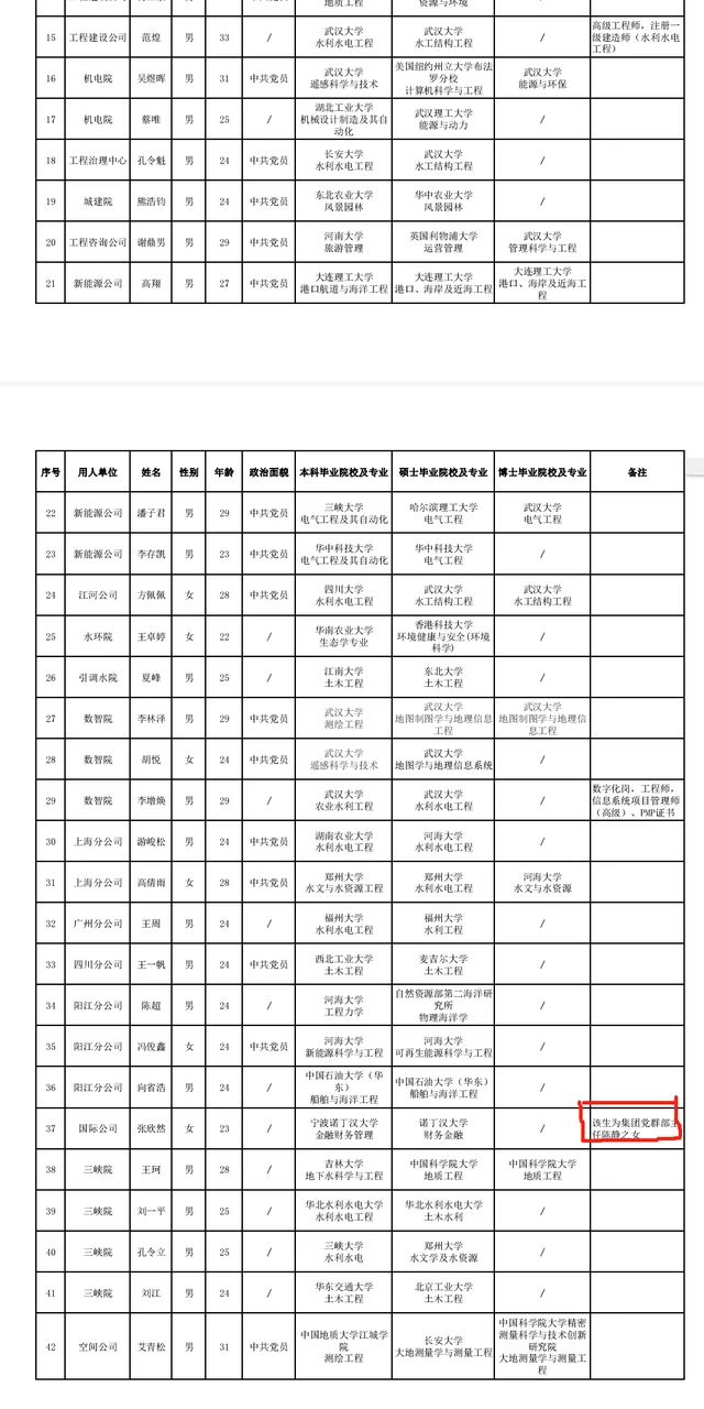 2023-02-08 14:29:07閱讀()大皖新聞2月7日,記者關(guān)注到,長江設(shè)計集團有限公司于2023年2月2日發(fā)布了長江設(shè)計集團2023年第三批擬聘人員信息公示,在公示表中記者看到該集團國際公司招聘人員張欣然的公示信息中,專門備注“該生為集團黨群部主任陳靜之女”。