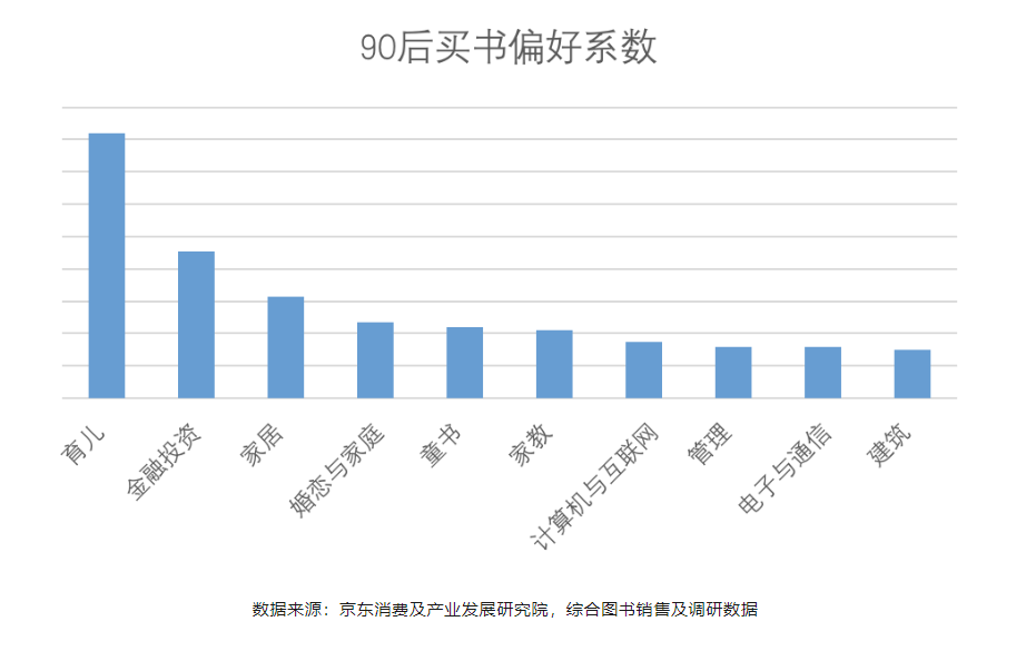 90后則忙著學(xué)習(xí)處理家庭生活和賺錢,在育兒、家居、婚戀類圖書的消費(fèi)偏好較高,同時(shí)在金融投資、計(jì)算機(jī)與互聯(lián)網(wǎng)、管理類圖書的消費(fèi)偏好較高。