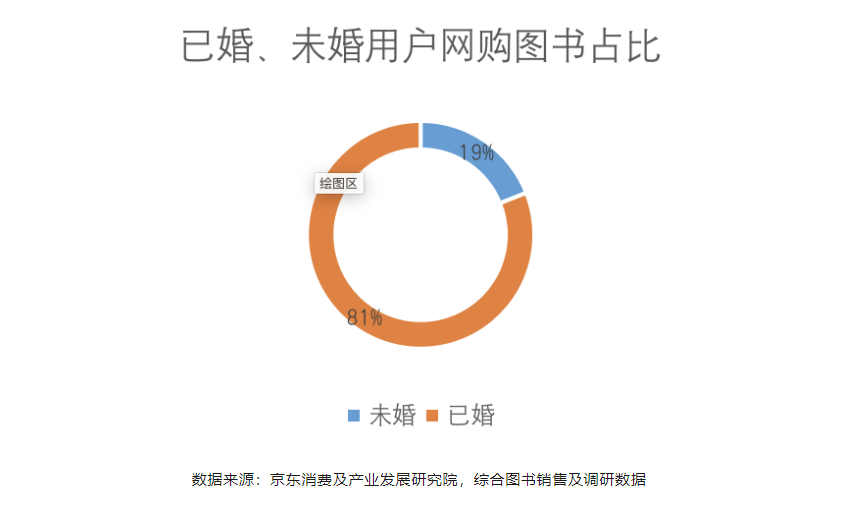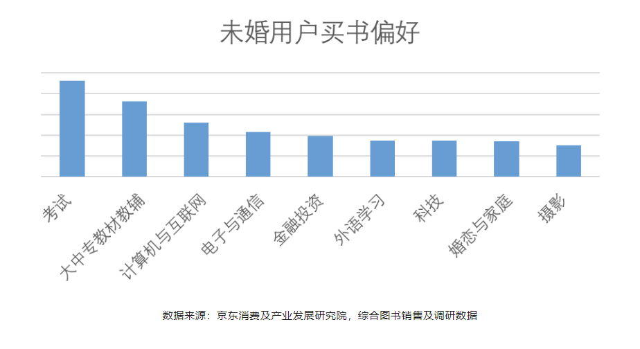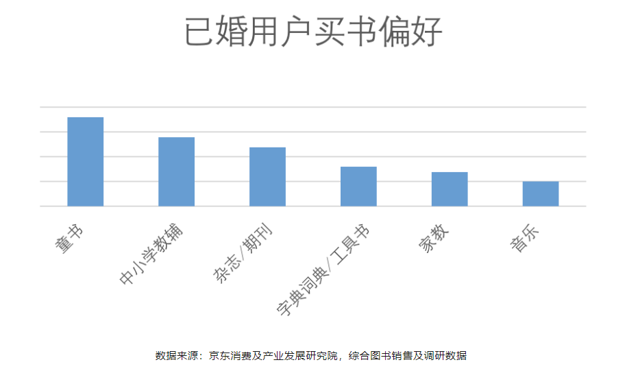 已婚用戶的書籍購買量是未婚用戶的4倍,買走了8成以上的圖書。從品類偏好來看,未婚用戶網(wǎng)購考試、教輔書、計(jì)算機(jī)等專業(yè)書的占比高于整體,讀書主要是為了拼事業(yè)和前程。然而在結(jié)婚后買書的重心改變了,已婚用戶在童書、中小學(xué)教輔、家教等品類的消費(fèi)占比高于整體,教育下一代成為網(wǎng)購圖書的第一出發(fā)點(diǎn)。