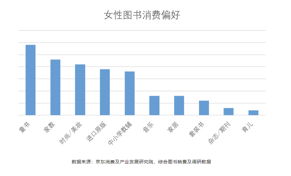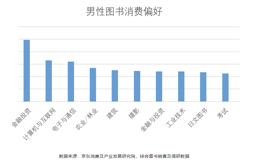 男性消費(fèi)者對(duì)金融投資、計(jì)算機(jī)與互聯(lián)網(wǎng)等領(lǐng)域更感興趣,閱讀興趣比較偏向?qū)I(yè)領(lǐng)域的知識(shí)類書籍。而女性則更喜歡購買與家庭教育和藝術(shù)相關(guān)的圖書,在童書、家教及時(shí)尚、音樂類圖書的消費(fèi)偏好較高。