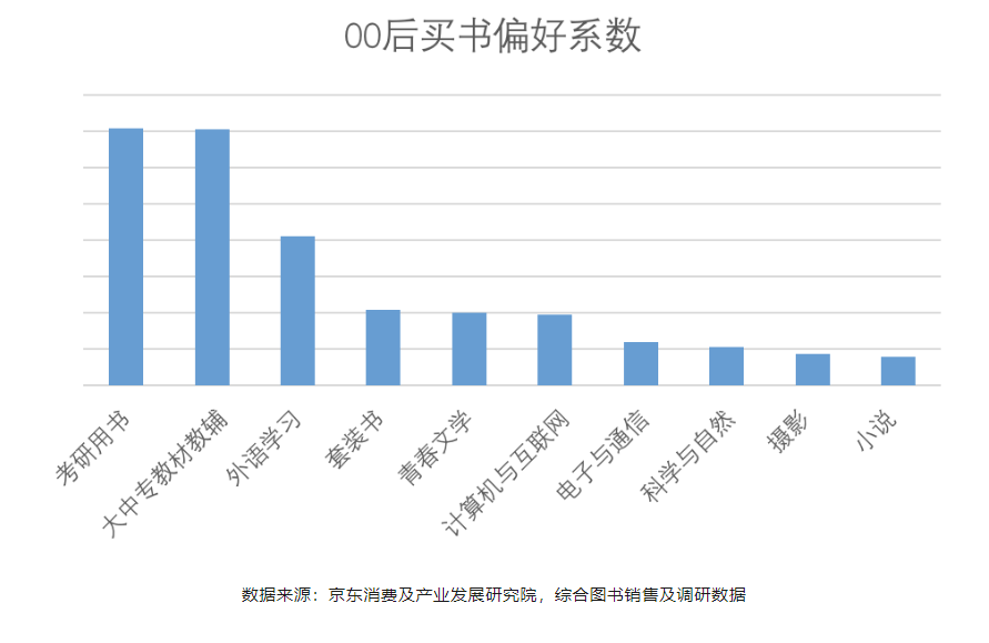 從00后的網(wǎng)購圖書偏好來看,00后讀書的主要壓力在于考研。他們?cè)诳佳杏脮?、大中專教材教輔、外語學(xué)習(xí)類圖書的消費(fèi)偏好最高,同時(shí)也愛買青春文學(xué)、攝影圖書和小說。