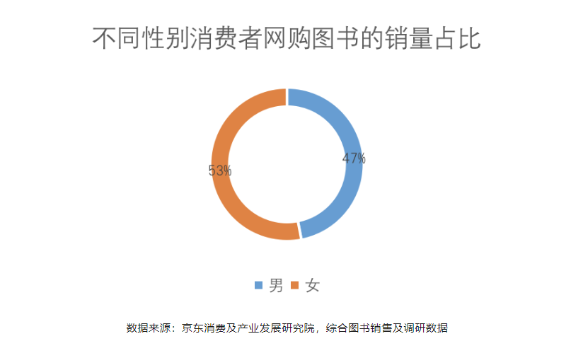 從報(bào)告中獲悉,京東的銷售情況顯示,女性網(wǎng)購圖書的銷量占比53%,高于男性6個(gè)百分點(diǎn)。