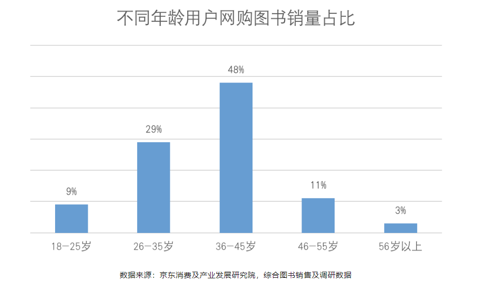 從購買力的角度看,36-45歲消費(fèi)者買走了近5成圖書,26-35歲消費(fèi)者買走了近3成圖書。