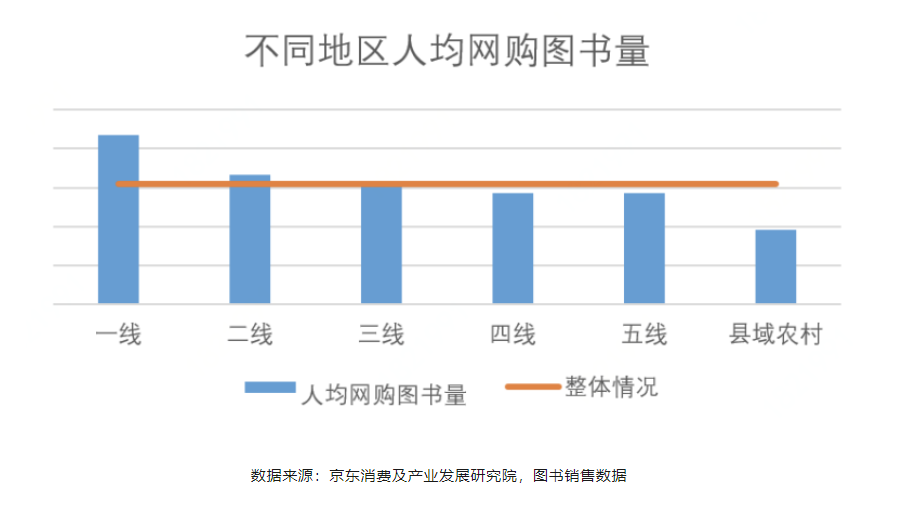 不同地區(qū)網(wǎng)購圖書的表現(xiàn)存在明顯的差異。一線城市人均網(wǎng)購圖書量高于全國均值8.8%,二線城市人均網(wǎng)購圖書量高于全國均值1.6%,三至五線城市網(wǎng)購圖書量略低于全國均值,縣域農(nóng)村人均網(wǎng)購圖書量低于全國均值8.8%。