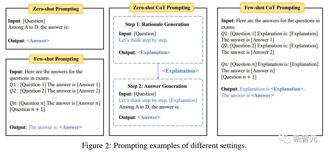 在零樣本的設置下,模型直接對問題進行評估;在少樣本任務中,在對測試樣本進行評估之前,先輸入同一任務中的少量例子(如5個)。