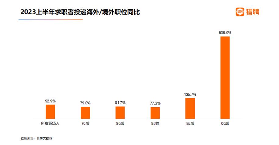 從2023上半年不同代際求職者投遞海外/境外職位的同比增長情況看,70后、80后、95前同比去年同期增幅均在80%左右,95后同比增長135.7%,00后同比激增539.0%。不過需要注意的是,單從人才投遞占比看,相較出海/出境,投遞國內(nèi)職位的求職者占據(jù)絕對比例。而00后相比其他代際在投遞海外/境外職位的占比中最小,但其同比增速快。