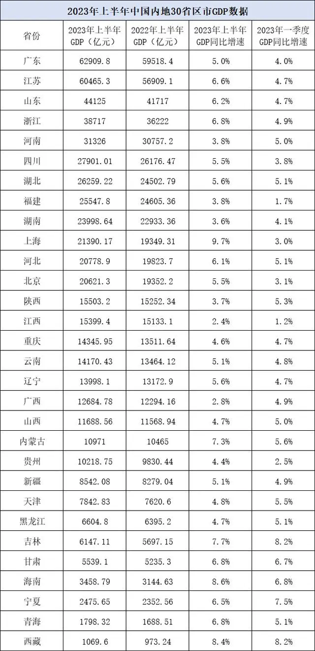 2023-07-29 08:49:18閱讀()澎湃新聞截至7月28日,已有30個(gè)省區(qū)市發(fā)布2023年GDP“半年報(bào)”,僅剩安徽省未發(fā)布2023年上半年經(jīng)濟(jì)運(yùn)行數(shù)據(jù)。