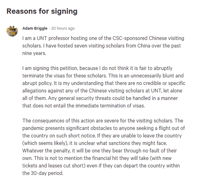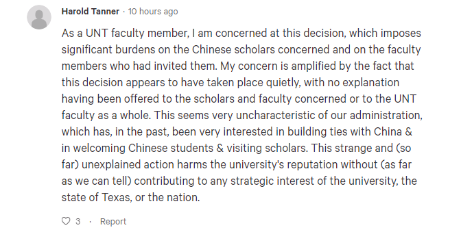 其中,一名直接參與了該校中國公派學生學者項目的教授,就在上述求助帖中留言,表示學校對這些中國留學生和學者的做法“是不公平的”,而且也是“毫無必要”的,因為他沒聽說過北得克薩斯州大學的任何中國公派留學生和學者中,有人遭到任何具體的指控。所以他無法理解為何學校要一下子就把所有中國公派留學生和學者全都趕走。