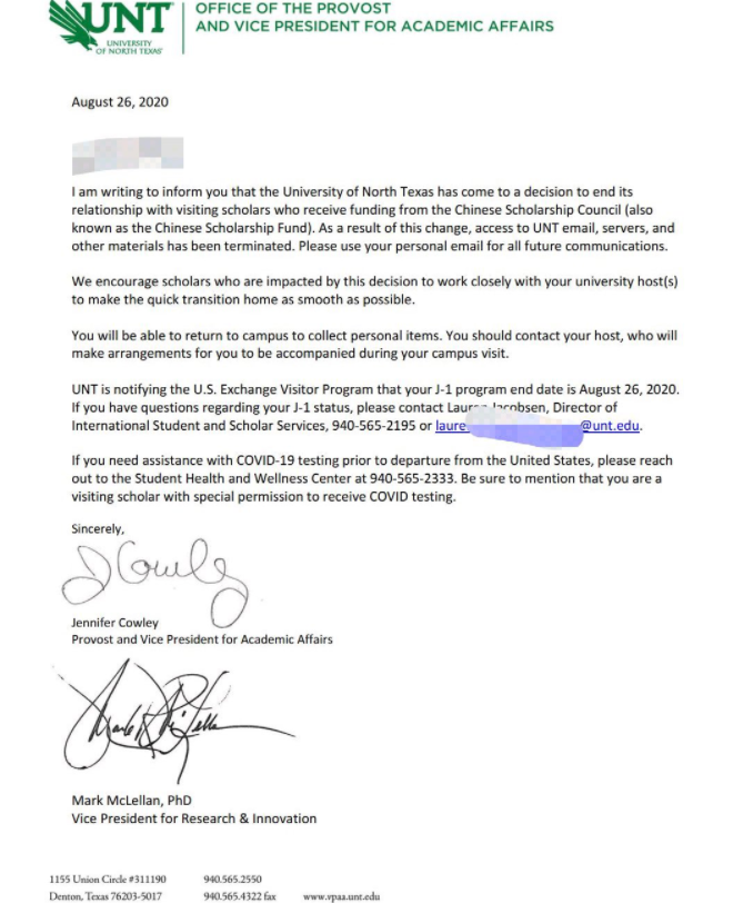 不過,截至我們發(fā)稿時,北得克薩斯州大學校方并沒有就其上周三宣布的這一驅趕中國公派學生和學者的決定,給出任何回應或說明。我們也尚未發(fā)現(xiàn)有任何美國的主流媒體報道了此事。